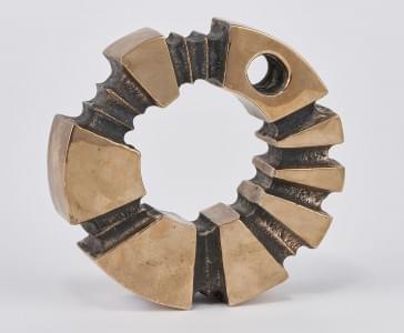 Trois cercles, bronze et pierre volcanique, signé, H 26 cm