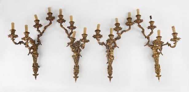 Trois feux à décor de putti, bronze doré et ciselé, H 41 cm