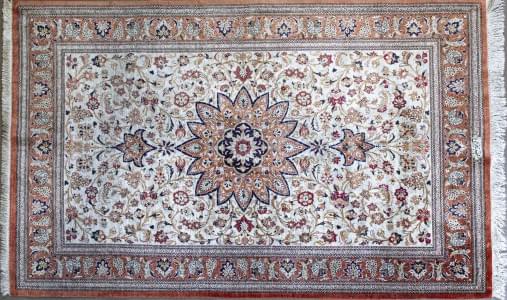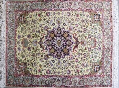 Soie, à décor de rinceaux et fleurs sur fond jaune, 145x197 cm