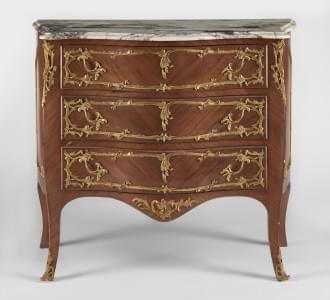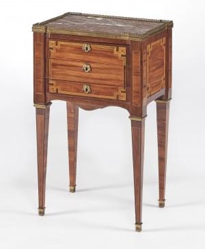 Trois tiroirs, placage de bois de rose et bronze doré, marbre ve...