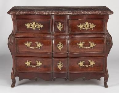 Cinq tiroirs sur trois rangs, noyer et bronze doré, marbre rose,...