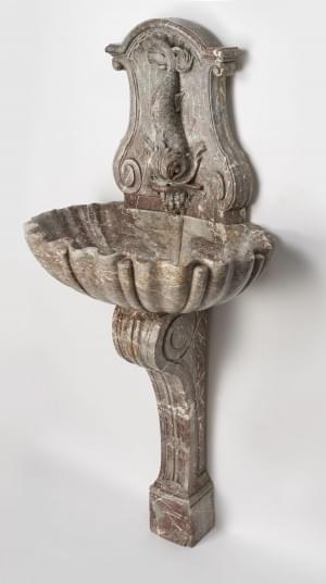 Marbre veiné rose sculpté d'un dauphin et d'une coquille formant...
