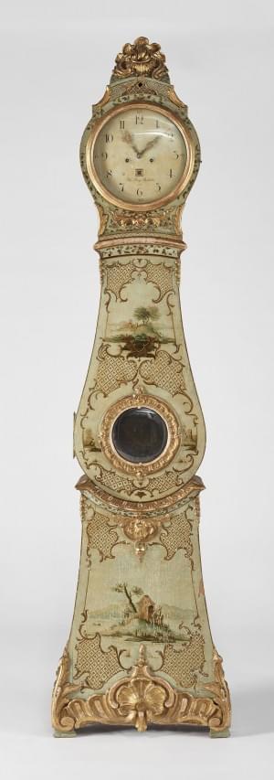 Bois laqué blanc et or, cadran émailé blanc signé Nils Berg, H 2...