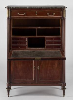 Un tiroir, un abattant et deux vantaux, acajou, filet de laiton...