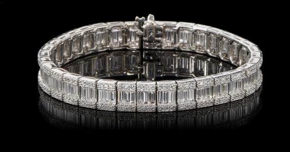 1084. Bracelet rivière serti de diamants taille baguette entourés de d...