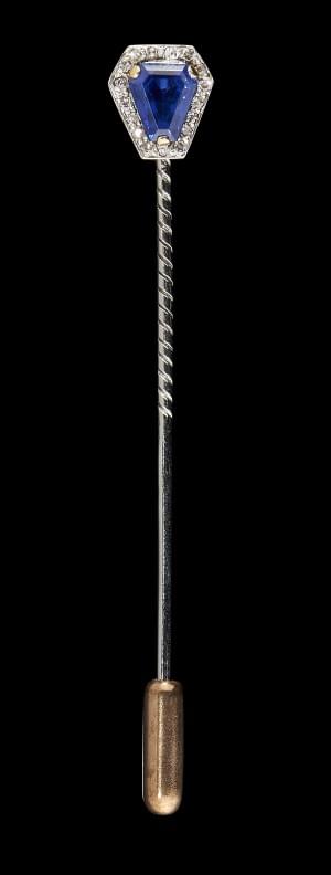 960. Epingle sertie d'un saphir trapèze entouré de diamants
