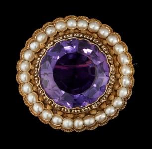 963. Broche sertie d'une améthyste taille brillant (env. 30 ct) entou...