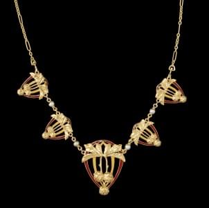 980. Collier Art Nouveau retenant cinq motifs feuillagés émaillés
