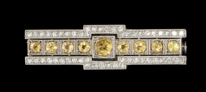 984. Broche sertie d'une ligne de saphirs jaunes en chute (env. 0.5 c...