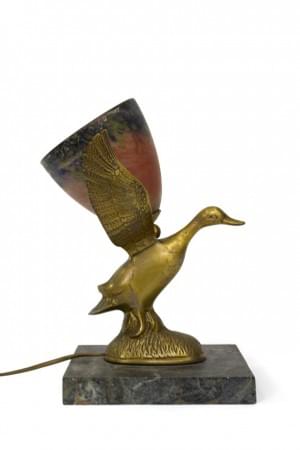 Abat-jour supporté par un canard, verre et bronze, H 31 cm