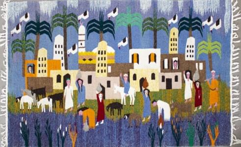 Figurant un village oriental animé, laine, 123x199 cm