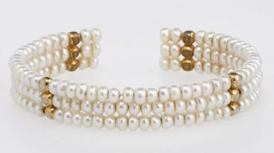 3100. Bracelet jonc ouvrant à trois rangs de perles ponctués de barret...