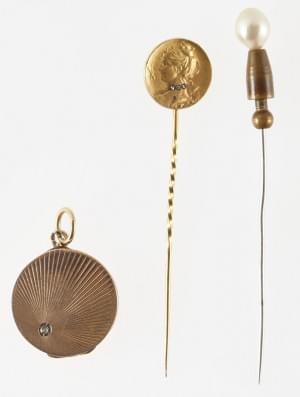 3117. Lot d'une épingle à chapeau et d'un pendentif guilloché rond ser...