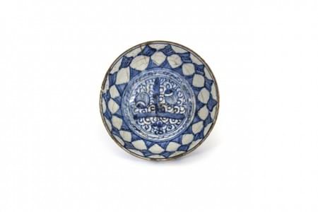 Céramique émaillée bleu à décor géométrique, H 7,5, D 18 cm