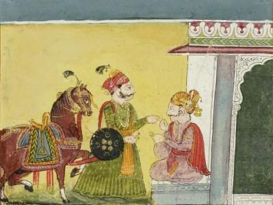 Personnage et cheval devant un palais, gouache sur papier, 12x17...