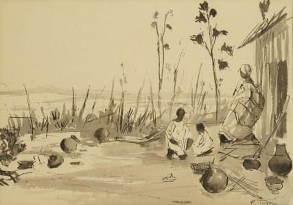 Mère et ses enfants dans un village d'Afrique, lavis d'encre, si...
