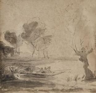 Barque sur un étang et arbres, lavis sur papier, 27,5x27 cm