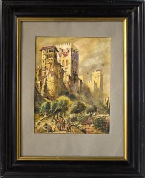 Scène galante devant une cité médiévale, gouache sur papier, 31x...