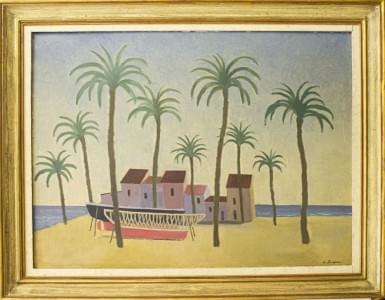 Vue du village, huile sur pavatex, 65x54 cm. On joint une affich...