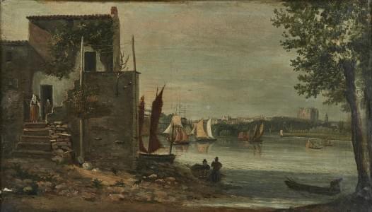 Paysage en bord de lac animé, huile sur carton, 27x40 cm