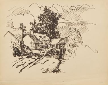 Trois esquisses à la plume figurant des paysages, encre sur papi...
