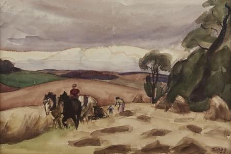 Chevaux de labour, aquarelle sur papier, signée, 35x52 cm