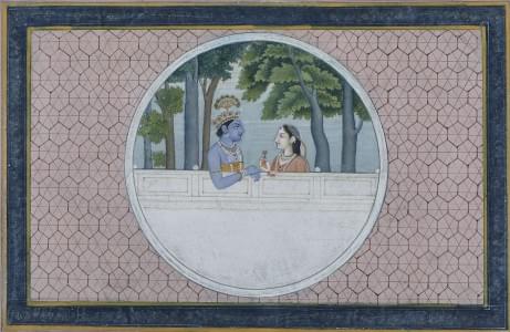 Krishna et Radha, miniature à vue ronde, pigments sur papier, 19...