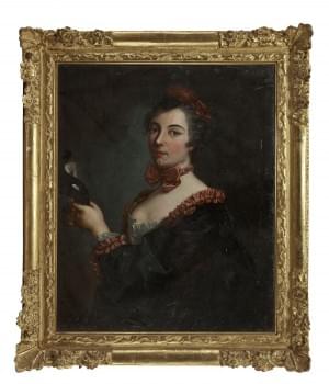 Jeune femme au loup et ruban rouge, huile sur toile, 80x63 cm. C...