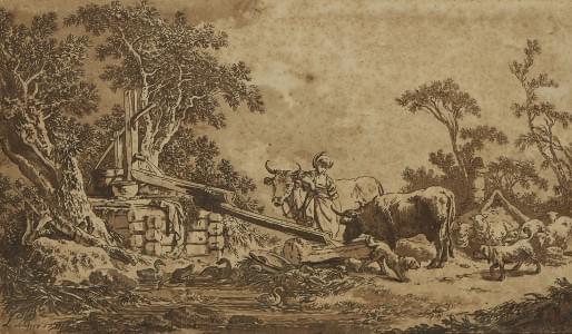 Scène au puits avec bergère, lavis et encre sur papier, 16x26 cm