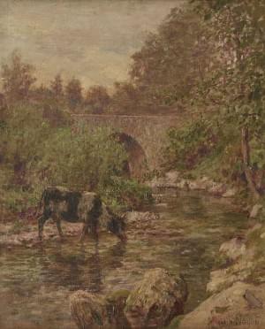 Vache buvant à la rivière, huile sur toile, signée, 45,5x38 cm....