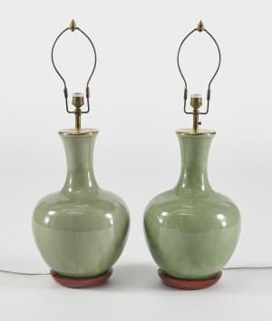 Porcelaine émaillée céladon, percés à l'électricité, H 43 cm