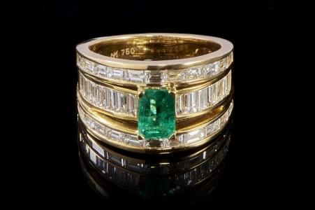 110. Bague sertie d'une émeraude taille émeraude (env. 0,8 ct) épaulé...