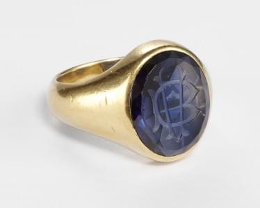 3249. Bague chevalière sertie d'une plaque de saphir probablement synt...