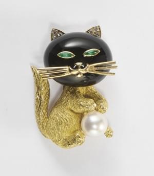 3253. Broche à motif de chat retenant une perle, à tête en onyx, aux y...