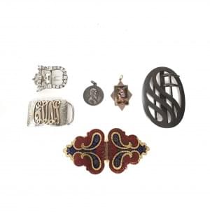 3269. Ensemble de quatre boucles de ceinture et de deux médailles reli...