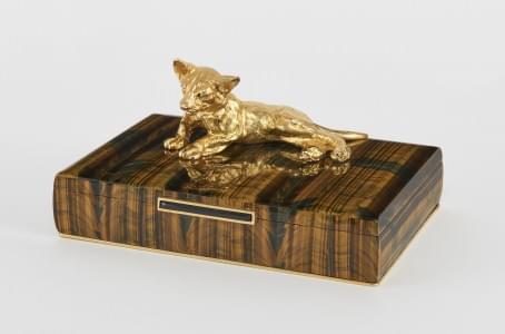 3284. Boîte en placage d'œil de tigre surmontée d'un motif de lionceau
