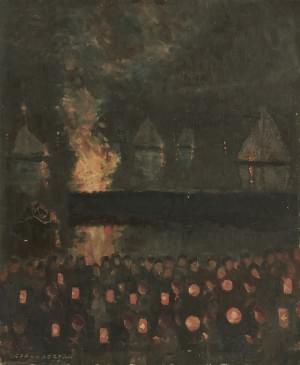 Foule regardant le feu de joie du 1er août sur le lac, huile sur...