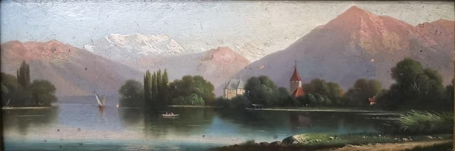 Vue du lac de Thoune, huile sur panneau, 8,5x25 cm