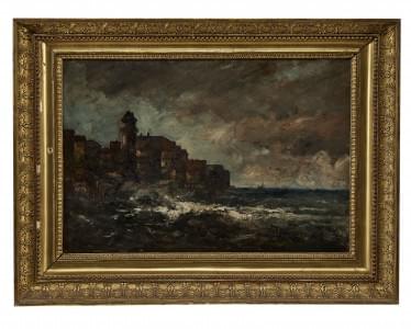 Ville au bord d'une mer agitée, huile sur panneau, 32x45 cm