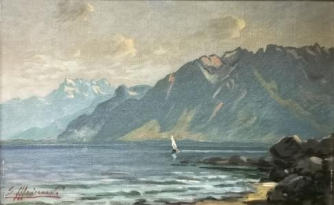 Le lac Léman, huile sur carton, signature non identifiée, 15x25...