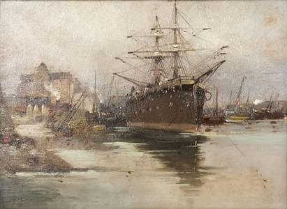 Deux mâts au quai, huile sur panneau, signée et datée 1899, 16x2...