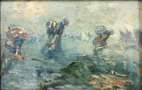 Soldats sur le champ de bataille, huile sur panneau,10x15 cm