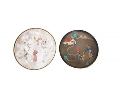 Cuivre et laiton émaillés, monogrammés RI 18,5 et 19 cm