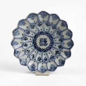 Porcelaine émaillée bleu blanc à décor de caractères et fleurs,...