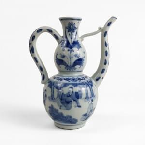Porcelaine émaillée bleu blanc à décor de personnages dans un ja...