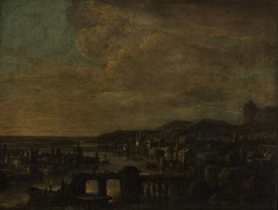 Vue d'une ville le long d'un fleuve, huile sur toile, 46x61 cm