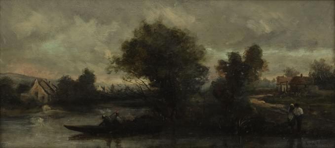 Paysage de pêcheurs sur l'étang, huile sur panneau, signée, 18x4...