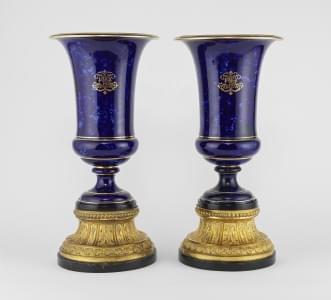 Porcelaine émaillée bleu nuit, socles en bois et cuivre doré rep...