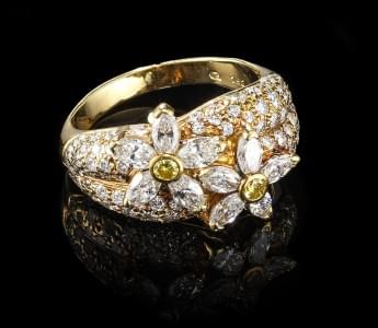 299. Bague à motif de deux fleurs serties de diamants et diamants jau...