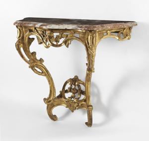 Bois sculpté doré, marbre rose veiné gris, 83x97x45 cm